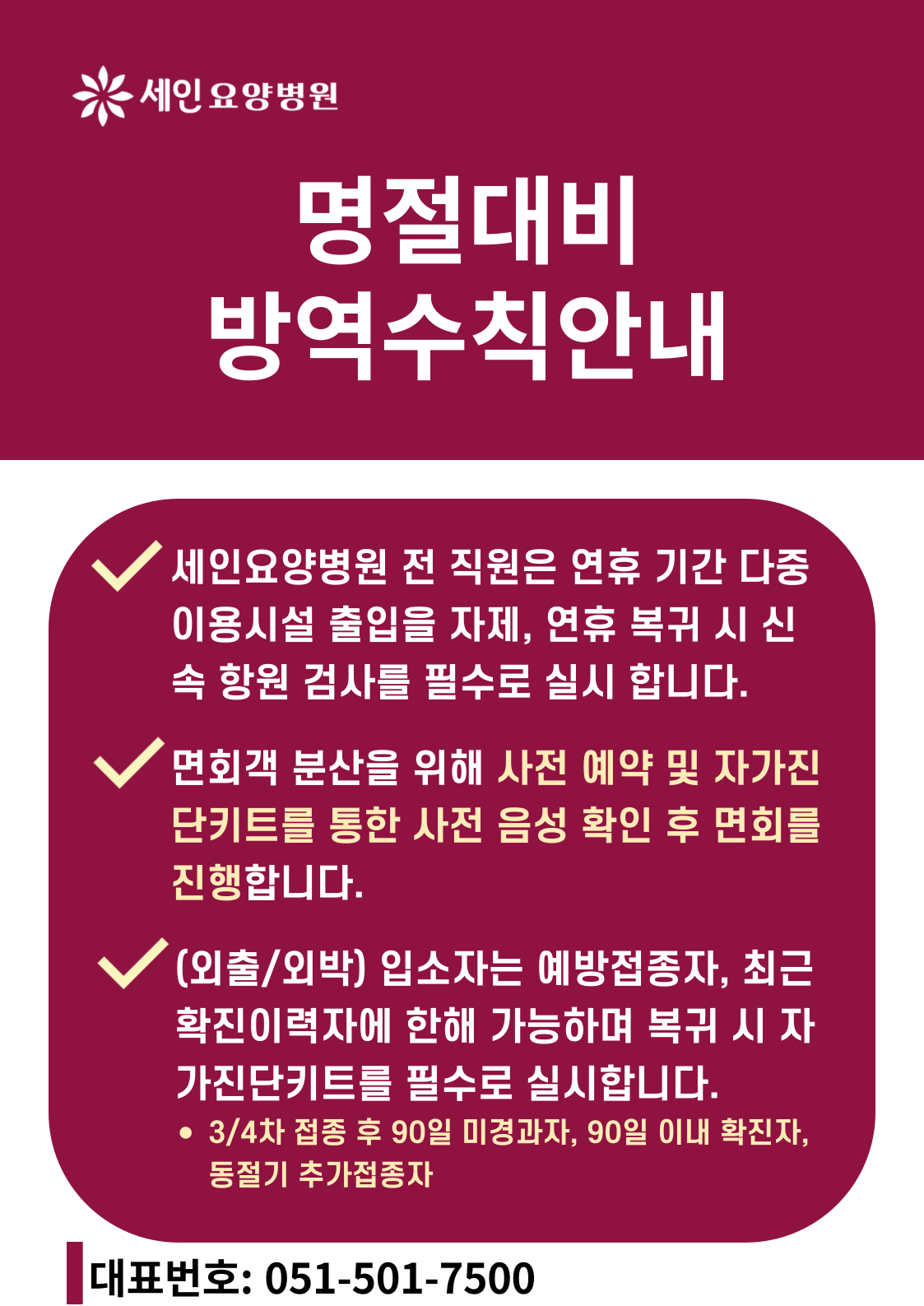 ¼³ ¿¬ÈÞ ±â°£ ¼¼Àοä¾çº´¿ø Àü Á÷¿øÀº ´ÙÁßÀÌ¿ë½Ã¼³ ÃâÀÔÀ» ÀÚÁ¦, ¿¬ÈÞ º¹±Í ½Ã ½Å¼Ó Ç׿ø °Ë»ç Çʼö ½Ç½Ã µî ¹æ¿ª¼öÄ¢À» °È