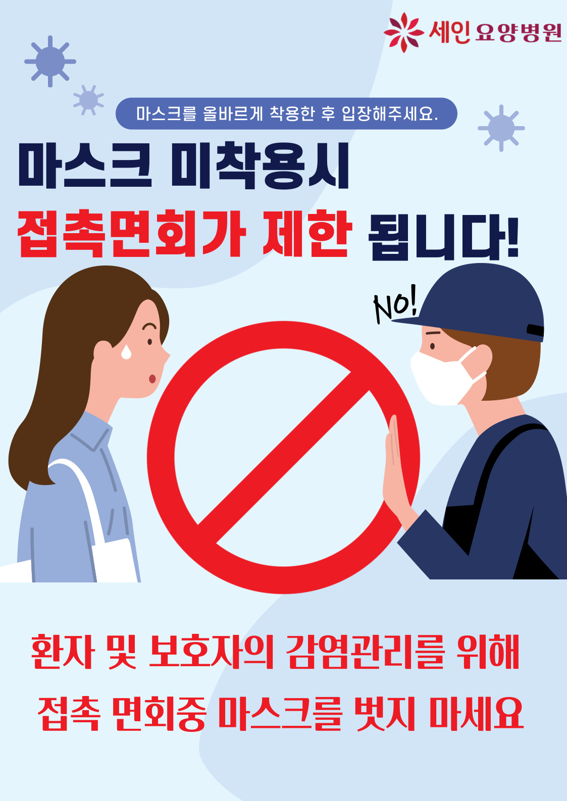 ȯÀÚ ¹× º¸È£ÀÚÀÇ °¨¿°°ü¸®¸¦ À§ÇØ Á¢ÃË ¸éȸ Áß ¸¶½ºÅ©¸¦ ¹þ´Â ÇàÀ§´Â ±ÝÁöµË´Ï´Ù.