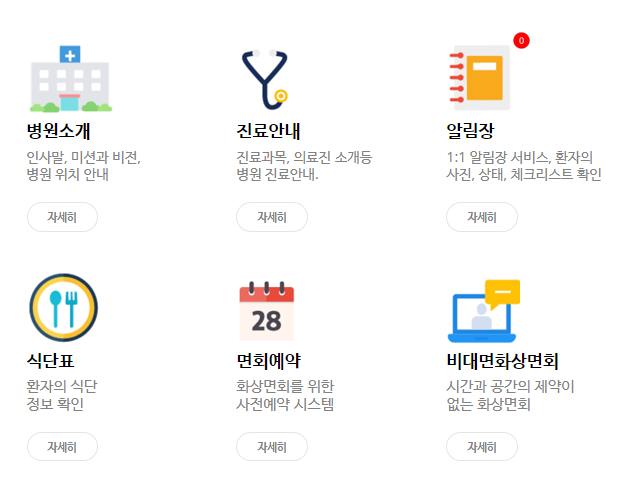 'º´¿ø¼Ò°³, Áø·á¾È³», ¾Ë¸²Àå, ½Ä´ÜÇ¥, ¸éȸ¿¹¾à, ºñ´ë¸éÈ»ó¸éȸ' ±îÁö ´Ù¾çÇÑ ¼ºñ½º¸¦ Á¦°ø ¹ÞÀ¸½Ç ¼ö ÀÖ½À´Ï´Ù.